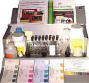ประโยชน์ ใช้ตรวจสอบฟอสฟอรัสที่อยู่ในรูปฟอสเฟสในสารละลายชนิดต่างๆ โดยเฉพาะน้ำในแหล่งน้ำธรรมชาติทั่วไป สามารถบอกปริมาณตั้งแต่ 0.0 ถึง 5.0 มิลลิกรัมต่อลิตร การตรวจสอบโดยใช้สารเคมีทำปฏิกิริยากับตัวอย่างน้ำแล้วเกิดสีน้ำเงิน นำไปเทียบกับแถบสี สีที่มีความเข้มแตกต่างกันซึ่งบอกบ่งปริมาณตั้งแต่ ต่ำมาก-สูง (0.0, 0.1,0.5 และ 5.0 มก. ต่อลิตร) วัดค่าฟอสเฟตได้ประมาณ 50 ครั้ง 9. ชุดตรวจสอบค่า เอ็น พี เค และ กรดด่างของดิน (ชุดใหญ่) ราคา 7,490 บาท