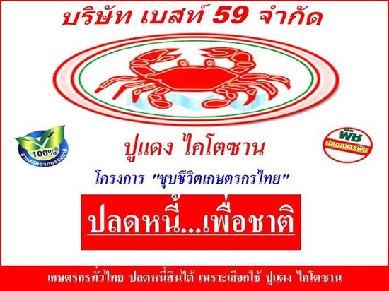 : ปูแดง ไม่ใช่ปุ๋ย ไม่ใช่ยา ไม่ใช่ฮอร์โมน ไม่ใช่วิตามิน ไม่ใช่สารเคมี สกัดจากเปลือกกุ้งธรรมชาติ 100 % เป็นสารไบโอโพลีเมอร์ชีวภาพจึงปลอดภัยต่อผู้ใช้และผู้บริโภคไม่มีสารพิษตกค้างและไม่เป็นอันตรายต่อสิ่งแวดล้อม มีคุณสมบัติเป็นตัวช่วยให้พืชทุกชนิดกินปุ๋ยกินแร่ธาตุได้ดียิ่งขึ้น เร่งราก เร่งใบ เร่งดอก เร่งผล ทำให้พืชโตเร็ว พืชแข็งแรงเพิ่มผลผลิตสร้างภูมิคุ้มกันทำให้พืชทุกชนิดทนต่อโรคและแมงศัตรูพืช ** ปูแดงไคโตซานสามารถใช้ได้ทั้งกับพืชและสัตว์ไม่ว่าจะเป็นหมู หมา กา ไก่ ใช้ได้หมดไม่มีอันตรายปลอดภัยต่อสิ่งแวดล้อมสำหรับผู้ที่สนใจและต้องการติดต่อขอใช้สินค้าฟรีโปรดให้ที่อยู่และเบอร์กลับด้วยนะคะเพื่อทางเราจะได้ทำการติดต่อกลับไปยังท่านที่สนใจและขอขอบพระคุณทุกท่านที่ให้ความสนใจและช่วยอนุรักษ์สิ่งแวดล้อมกับโครงการชุบชีวิตเกษตรกรไทยลดต้นทุนปุ๋ยและยาฆ่าแมลง