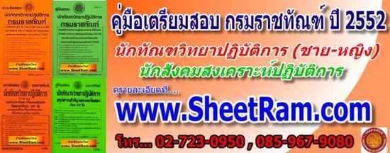 กรมราชทัณฑ์ ปี 2552 คู่มือเตรียมสอบ แนวข้อสอบ VCD ติว จาก SHEETRAM.COM รับสมัครสอบแข่งขันเพื่อบรรจุบุคคลเข้ารับราชการ ตำแหน่งนักทัณฑวิทยาปฏิบัติการ (ชาย) , นักทัณฑวิทยาปฏิบัติการ (หญิง) และ นักสังคมสงเคราะห์ปฏิบัติการ รวม 30 อัตรา (วันที่ 7-29 พ.ค.52) WWW.SHEETRAM.com ร้านชีทออนไลน์ของชมรมลูกพ่อขุนประยุกต์ผู้ผลิตชีทสรุป-เฉลยข้อสอบประกอบ การเรียนของมหาวิทยาลัยรามคำแหง