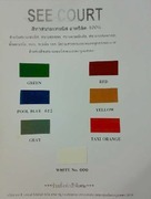 สีทาสนาม SEE-COURT คุณสมบัติ : เป็นสีอะครีลิคแท้ 100 % ผสมกับผงสีที่นำเข้าจาก ประเทศเยอรมันนี ที่ทนต่อสภาพอากาศร้อน สารเคมี แสงอุลตร้าไวโอเลต และกันน้ำ ป้องกันการลื่น รวมทั้งผสมสารป้องกันเชื้อราอีกด้วย การใช้งาน: เหมาะสำหรับ ทาพื้นสนามเทนนิส สนามบาสเกตบอล สนามกีฬาทุกชนิด พื้นโรงงาน พื้นคอนกรีตทุกชนิด ข้อมูลจำเพาะ : ชนิดอะครีลิคแท้ 100% สีเขียว สีฟ้า สีแดง สีขาว และสีเทา ฯ