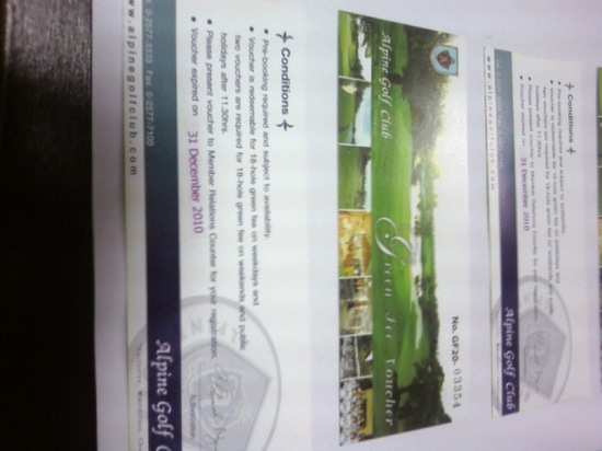 ต้องการขายคูปองเล่นกอล์ฟที่สนามกอล์ฟอัลไพน์ จำนวน 4 ใบ ราคาทั้งหมด 5,200 บาท เล่นกอล์ฟวันธรรมดาใช้คูปอง 1 ใบต่อคน วันหยุดใช้คูปอง 2 ใบต่อคน คูปองใช้ได้ถึง 31 ธค 53 สนใจติดต่อคุณวิรัช 086-3173012