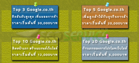 อย่าซักช้าที่จะเลือกใช้บริการจากทางเรา เพราะอันดับในหน้าค้นหากำลังรอท่านขึ้นไป สนใจใช้บริการ หรือติดต่อสอบถามได้ที่ 080-080-8967 หรือเข้าไปอ่านรายละเอียดได้ที่เว็บไซต์ (http://seoservice.in.th/) ของเราได้เลยครับ การันตีมีผลงานติดหน้าแรกในคีย์ระดับที่เรียกว่า "ยาก" อยู่มากมายเลยทีเดียว !!
