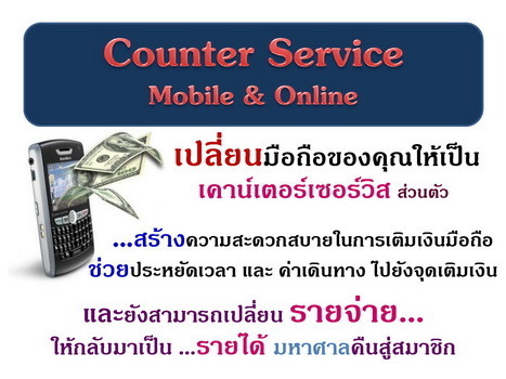 ไม่ว่าคุณจะใช้โทรศัพท์มือถือเครือข่ายใด...ในชีวิตประจำวันของคุณ คุณจะต้องเติมเงินมือถือ " แล้วจะทำยังไงล่ะให้มีรายได้กลับมาคืนในส่วนนี้ ดูรายละเอียดคลิก!!>>