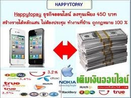 HappyToPay เป็นงานบริการทางด้านเติมเงินโทรศัพท์ ครับ ไม่มีขายสินค้า ไม่มีประชุมงาน ลงทุนครั้งเดียว450บาท สนใจเข้ามาดูก่อนนะครับ