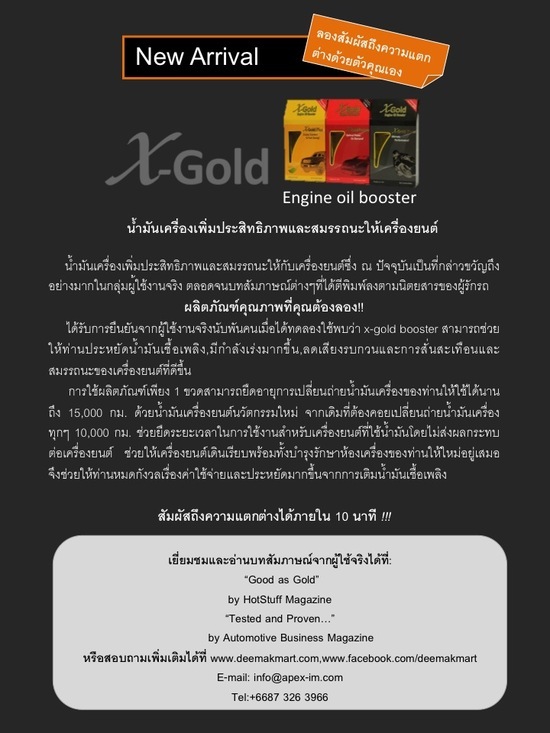 ได้รับการยืนยันจากผู้ใช้งานจริงนับพันคนเมื่อได้ทดลองใช้พบว่า x-gold booster สามารถช่วยให้ท่านประหยัดน้ำมันเชื้อเพลิง,มีกำลังเร่งมากขึ้น,ลดเสียงรบกวนและการสั่นสะเทือนและสมรรถนะของเครื่องยนต์ที่ดีขึ้น
