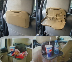 ชุดถาดวางอาหารในรถยนต์ มีที่สวมแก้วน้ำ ขวดน้ำ ติดตั้งได้กับรถทุกรุ่นทุกยี่ห้อ (ดูรูปประกอบ) ขนาดโดยประมาณ 15X26 cm. ถาดวางอาหารสามารถพับเก็บได้เมื่อไม่ได้ใช้งาน มีให้เลือก 2 สี ครีม และ ดำ ตามรูป