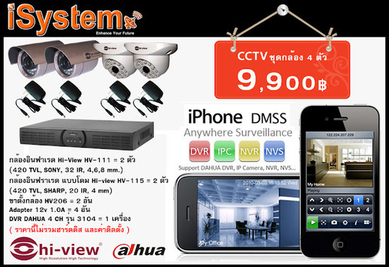 กล้องวงจรปิดดูผ่าน iPhone, iPad ชุดสุดคุ้ม กล้อง 4 ตัว ราคา 9,900 บาท