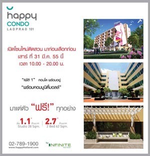 แฮปปี้คอนโดลาดพร้าว 101 เปิดโซนใหม่คอนโดห้องติดสวนสไตล์รีสอร์ทสุดหรูที่คุณเป็นเจ้าของได้ พร้อมอยู่พร้อมคอมมูนิตี้มอลล์ ที่ประกอบไปด้วยร้านค้าชั้นนำอาทิ เอ็มเค โออิชิราเมน แม็กแวลู ธนาคารออมสิน ร้านกาแฟไนท์ตี้โฟร์ และร้านค้าอีกมากมาย มาก่อนเลือกก่อนกับโปรโมชั่น มาแต่ตัว ฟรี ทุกอย่าง ในวันเสาร์ที่ 31 มีนาคมนี้ เวลา 10.00 20.00 น. สอบถามเพิ่มเติม โทร.02-789-1900 # 1 หรือ www.happythailand.com