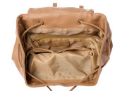 เมื่อเปิดออก ด้านบนแต่งสายหนังแบบผูกรูดได้ ด้านในบุกระเป๋าบุด้วนผ้าสีน้ำตาลอย่างดีเลยค่ะ แบ่งกระเป๋าออกเป็น 1 ช่องใหญ่ มีช่องซิปใส่ของ 1 ช่อง และช่องใส่โทรศัพท์อีก 2 ช่องค่ะ