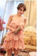 เสื้อผ้าแฟชั่นนำเข้า : dress เดรสหรูใส่ออกงาน สีชมพูอมส้ม แต่ระบายรอบตัวเป็นชั้น ไหล่เฉียง น่ารักมาก สามารถใส่ออกงานได้ asiastreetfashion (พร้อมส่ง)