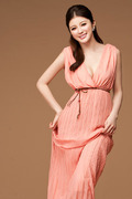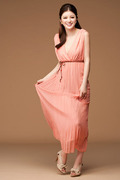เสื้อผ้าแฟชั่นนำเข้า maxi dress - ชุดเดรสยาว แขนกุด กระโปรงอัดพลีท สีโอรส สวยมาก ใส่ออกงานได้ asiastreetfashion (พร้อมส่ง)