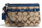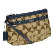 กระเป๋าสตางค์คล้องแขน COACH รุ่น GALLERY SIGNATURE MEDIUM WRISTLET F48299 สีน้ำตาล KHAKI ลาย Signature COACH ด้านหน้ามีสายหนังสีน้ำเงินเข้ม Blue Navy คาดพร้อมกับคำว่า Coach ติดอยู่ตรงกลาง สายคล้องแขนเป็นสายหนังสี Blue Navy ซิปด้านในบุผ้าสีน้ำตาลอ่อน พร้อมช่องเล็ก ๆ ไว้เก็บของกระจุกกระจิกให้หนึ่งช่อง