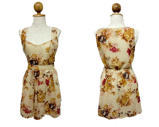 Detail: เดรสผ้าชีฟองลายดอก แขนกุด มีซับในทั้งตัว ลายดอกไม้สีทอง ปนชมพูเข้ม สม็อกด้านหลัง