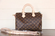 กระเป๋าถือ LV รุ่น speedy shoulder 30 (ซิปยาว12") ลาย LV กระเป๋าทรงหมอนรุ่นใหม่สุดคลาสสิก เล่นแถบด้านข้างกระเป๋าด้วยหนังแท้แบบฝอกฟาด ด้านในกระเป๋าบุด้วยผ้าสีน้ำตาลเนื้อผ้าแนบเรียบกับหนังด้านใน ระบุเลข Serial Number ตัวกระเป๋าและหู้หิ้วใช้หนังแท้ 100% หูหิ้วแบบหนังแท้ฝอกฟาดจะเปลี่ยนเป็นสีเข้มเมื่อโดนอากาศ