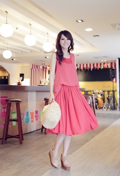 เดรสแฟชั่นเกาฟลี ผ้า cotton ตัดต่อผ้าชีฟอง จั้มเอว สีแดง