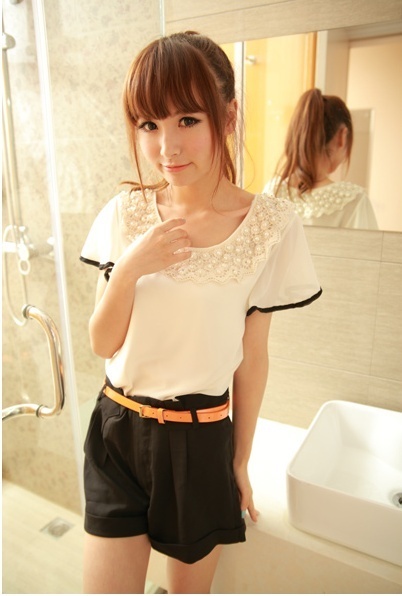 เสื้อแฟชั่นเกาหลี ผ้าชีฟอง แต่งผ้าถักและไข่มุกที่คอเสื้อ สีขาว *ไม่มีซับใน