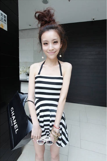 เดรสแฟชั่นเกาฟลี ผ้ายืด สายคล้องคอปรับได้ สีขาว-ดำ