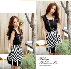 เดรสแฟชั่นเกาหลี ผ้า spandex แต่งผ้าชีฟองที่แขนเสื้อ จั้มเอว สีดำ