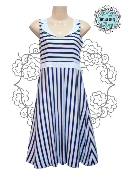 ชุดเดรส วินเทจ Dress Vintage แถบ ขาว-น้ำเงิน ไซต์ S-M ค่ะ