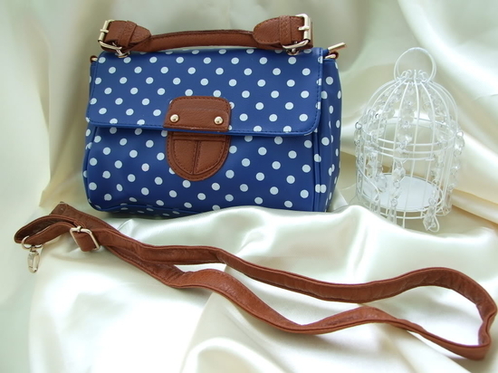 กระเป๋าแฟชั่น สีฟ้าลายจุด เก๋ไก๋ทั้งแบบถือและสะพายยาว สไตล์เกาหลี ตัวกระเป๋าเป็นหนังผสม