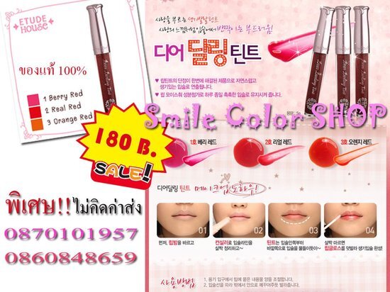 Etude tint ของแท้100% มีสีส้ม สีแดง สีชมพู ราคาเพียง180บาท ไม่คิดค่าหิ้ว ไม่คิดค่าส่ง ของมีจำนวนจำกัด สนใจติดต่อสอบถามรายละเอียดได้ที่คุณโบค่ะ 0870101957 รีบๆๆนะคะ สินค้าใกล้หมดแล้วคะ