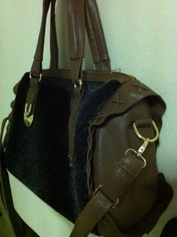 กระเป๋าแฟชั่นและสะพาย สีกากี มีขนสีดำสวยๆ