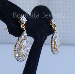 ชิ้นนี้ ดีไซน์ด้านบนเป็นเพชรหนามเตย 1เม็ด ด้านล่างเป็นตุ้งติ้งทรงหยดน้ำ มีเพชรหนามเตยข้างในหยดน้ำ 2 เม็ด 2 ขนาด เพชรวิ๊งวิ๊ง สวยสวย น่าใส่มากครับ