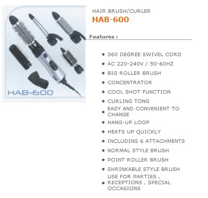 อุปกรณ์ตกแต่งทรงผมชุดใหญ่ ที่จัดชุดอุปกรณ์หลากหลายประเภท เพื่อใช้ตกแต่งทรงผมได้ทุกรูปแบบ อุปกรณ์ทั้งหมดบรรจุอยู่ในกล่องเดียวกัน พร้อมไดร์เป่าผมแบบแท่งกลมขนาด950 Watt ขนาดความยาวเครื่อง 8.0 นิ้ว ขั้วสายหมุนได้ 360 องศาตามการใช้งาน สามารถปรับร้อนของลมได้ 2 ระดับ มีปุ่มปรับลมเย็น ใช้พลังงานจากไฟฟ้า 220-240 โวลท์ ส่วนหัวเป่าลมของไดถูกออกแบบให้ใช้สวมเข้ากับอุปกรณ์ชนิดต่าง ๆ ได้ 6 แบบ ได้แก่