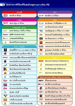 • ซึ่งเป็นช่องรายการฟรีทีวีไทย ผ่านดาวเทียม Thaicom 5 กว่า 100 ช่อง มีหลากหลายรายการ ทั้งช่อง 3, 5, 7, 9, NBT, TPBS, PSI Channel, สบายดี, You Channel, Fan TV, Bang Channel, Green Channel, ACT, MIX, TV Pool และอื่นๆ อีกมากมาย ทั้งช่องภาพยนตร์, เพลง, ข่าว, สารคดี, ศาสนา, การ์ตูน รวมถึงช่องรายการจากประเทศเพื่อนบ้าน