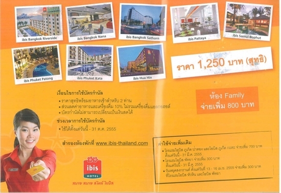 - โรงแรมไอบิส ภูเก็ต ป่าตอง และ ไอบิส ภูเก็ต กะตะ จ่ายเพิ่ม 700 บาทในช่วงวันที่ 23 ก.พ. 2555 - 31 มี.ค. 2555