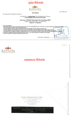 พอดีผมกับครอบครัวไปเที่ยวเชียงรายมาเมื่อตอนปีใหม่ที่ผ่านมา (31 ธค 2555) แล้วมีจับฉลากชิงรางวัลกัน ครอบครัวผมได้รางวัลที่2 คือคูปองเข้าพักที่ Katiliya ห้อง Superior Suite ฟรี 2 คืน รวมอาหารเช้า2ท่าน (เป็นห้องที่ดีที่สุดในรีสอร์ท ห้องกว้างมาก 70 กว่าตารางเมตร ลองหารูปจากในเน็ตเอาได้ครับ แถมโรงแรมก็เพิ่งเปิด ใหม่เอี่ยมไม่มีฝุ่นเลย ตอนเช้าเปิดหน้าต่างดูหมอกได้เลยครับ สวยมาก) สามารถใช้คูปองได้ระหว่าง 1 มีนาคม - 31 สิงหาคม 2555 แต่ไม่สามารถใช้ได้ช่วง 12-17 เมษายน 2555