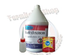 แบบผสมน้ำ - ใช้ในกรณีที่ไม่เห็นตัวปลวก อาจจะอยู่ตามซอกพนังกำแพง ตามร่องไม้ หรือต้องการอัดไปตามท่อ ฯลฯ ให้นำผงยามาผสมในอัตราส่วนปริมาณ 50 กรัมต่อน้ำ 750 ซีซี แล้วนำส่วนผสมนี้ไปฉีดพ่นในอัตรา 50 มิลลิลิตรต่อพื้นที่ 1 ตารางเมตร ฉีดพ่นตามรอยทางเดิน ซอกมุมที่หลบซ่อนของแมลงทั้งหลาย