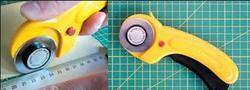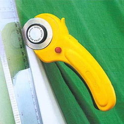 โรตารี่คัตเตอร์ใบมีกลมด้ามพลาสติคสีเหลือง ขนาด 45 มม.ใช้สำหรับตัดผ้า ใบมีดสามารถเปลี่ยนได้ พร้อม Safety Lock ป้องกันคมมีดขณะไม่ได้ใช้งาน