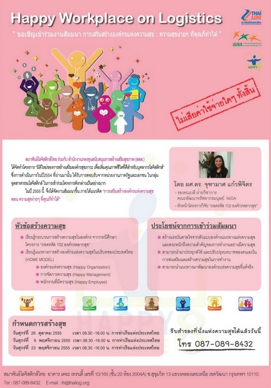 (ไม่มีค่าใช้จ่าย)สมาพันธ์โลจิสติกส์ไทย ขอเรียนเชิญเข้าร่วมสัมมนา "การเสริมสร้างองค์กรแห่งความสุข : ความสุขง่ายๆที่คุณก็ทำได้"