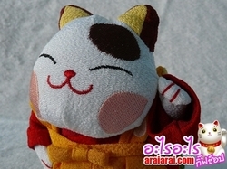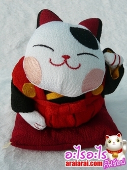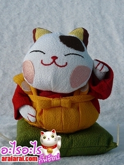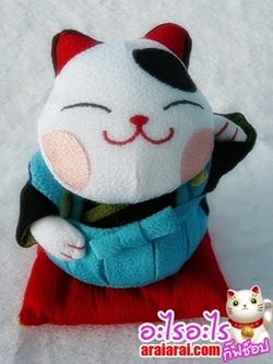 ตุ๊กตาแมวนำโชค (มาเนะคิเนะโกะ) สวมชุดโชกุน นั่งบนเบาะ ทำจากผ้ากิโมโน ยกมือซ้ายกวัก สูงประมาณ 14.5 ซ.ม. กว้างประมาณ 11 ซ.ม.