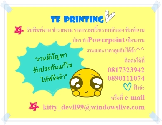 แวะชมผลงานตัวอย่างได้ที่ http://www.facebook.com/pages/TF-printing-รับพิมพ์งานปริ๊นงานทำรายงานทำนามบัตรทุกชนิด/182861578505619?ref=hl