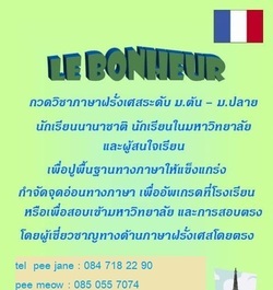 กวดวิชาภาษาฝรั่งเศสLE BonHeuRระดับ ม.ต้น ม.ปลาย ปูพื้นฐานทางภาษาให้แข็งแกร่ง กำจัดจุดอ่อนทางภาษา085 055 7074//084 718 2290 เพื่ออัพเกรดที่โรงเรียน หรือเพื่อสอบเข้ามหาวิทยาลัย โดยผู้เชี่ยวชาญทางด้านภาษาฝรั่งเศสโดยตรง และมีประสบการณ์การสอนมากกว่า 10 ปี สามารถสอนได้ทุกระดับ ตั้งแต่คนที่ไม่มีพื้นฐานเลยจนถึงระดับสูงเพื่อนำไปสอบเรียนต่อประเทศ...