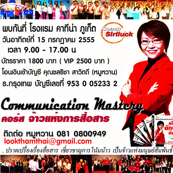 จะมีคอร์สสัมมนา “จ้าวแห่งการสื่อสาร” จัดที่ ภูเก็ต วันอาทิตย์ที่ 15 กรกฎาคม 2555 นี้