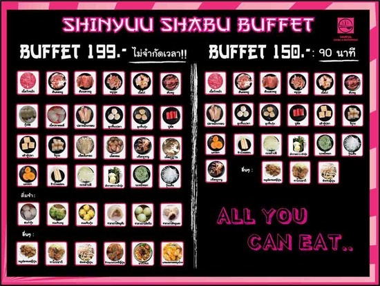 ชินยูบุฟเฟต์ชาบูเพียง 199บาท รวมชาบู+ทาโกยากิ+เทปันยากิ+ติ่มซำ+โอโคโนมิยากิ +แซลมอนสมุนไพร ซอสมัสตาร์ด +ข้าวแกงกะหรี่+ ยากิโซบะ..ไม่จำกัดเวลาและปริมาณค่ะ