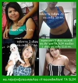 กฎ 5 ข้อ สำหรับลูกค้า TA SLIM+ (ทา สลิม พลัส) ข้อ 1. ทำตัวเหมือนคนจนพยายามอยู่ในอุณภูมิห้องปกติ ถึงร้อน ข้อ 2. ลูกค้าที่ทำงานอยู่ในห้องแอร์ตลอดทั้งวัน กลับมา บ้านช่วงเย็นห้ามเปิดแอร์และพัดลมเด็ดขาด เสาร์-อาทิตย์ เป็นช่วงเวลาพิเศษของคุณ เอาพัดลมกับแอร์ไปทิ้งซะ คุณเองต้องให้ความร่วมมือกับอาหารเสริมด้วยเพื่อให้มี สิทธิภาพและเห็นผลเร็ว ข้อ 3 จงจำไว้ว่า ยิ่งเหงื่อออกมาเท่าไหร่จะเห็นผลไว เท่านั้น ข้อ 4 ระยะเวลาระหว่างทานอาหารเสริมกับการทานอาหารมื้อหนัก จำเป็นอย่างยิ่งที่ต้องเว้นให้ได้ 20 นาที ค่ะ ข้อ 5 ข้อห้าม " กินอาหารเสริมปุ๊บทานข้าวตามปั๊บห้ามเด็ดขาดค่ะ " ***สำหรับลูกค้าที่ไม่ปฏิบัติตามกฎอาจเห็นผลช้า