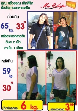 จากประสบการณ์ตรงของดิฉันเองค่ะทำงานอยู่ธนาคารแห่งหนึ่ง อยู่หน้าเคาเตอร์กินก็ไม่เป็นเวลา เข้าห้องน้ำก็ไม่มีเวลาเข้า ระบบภายในค่อนข้างมีปัญหา ท้องผูกเป็นประจำ 3-4 วันจึงถ่าย ท้องผูกมากจนมีเลือดออกมาด้วยค่ะ แล้วก็กินหนักมื้อเย็นเป็นคนทานข้าวได้เยอะค่ะ มีน้ำหนักเกิน(อ้วน)ขึ้นมาเกือบ 10 kg. ทำให้รู้สึกอึดอัดกับปัญหาส่วนเกิน โดยเฉพาะท้องผูกมาก จนวันนึงมีเพื่อนแนะนำให้รับประทาน slend oat (ดีท๊อกซ์ ไฟเบอร์) เพียงซองแรกดิฉันก็ประทับใจใน slend oat มาก ตื่นเช้าก็ถ่ายเลย ไม่เจ็บ ไม่ปวดบิด แล้วยังนำของเก่าที่ค้างอยู่ในลำไส้ออกหมด ดิฉันจึงเชื่อในผลิตภัณฑ์ slend oat และได้ทดลองรับประทานร่วมกับ mee shape ซึ่งเป็นตัว block&burn ควบคู่ไป ไม่น่าเชื่อ!! ดิฉันลดน้ำหนักจากเดิม 57 kg. มาเป็น 49 kg. ภายในเวลา 1 เดือน ลดได้ถึง 8 kg. โดยไม่โทรม กระชับ ผิวพรรณสดใส ไปไหนมาไหนมีแต่คนทักตลอด ดิฉันจึงเกิดธุรกิจโดยอัตโนมัติ สุดยอดจริงๆ ค่ะ สวยแล้วรวยด้วย!!