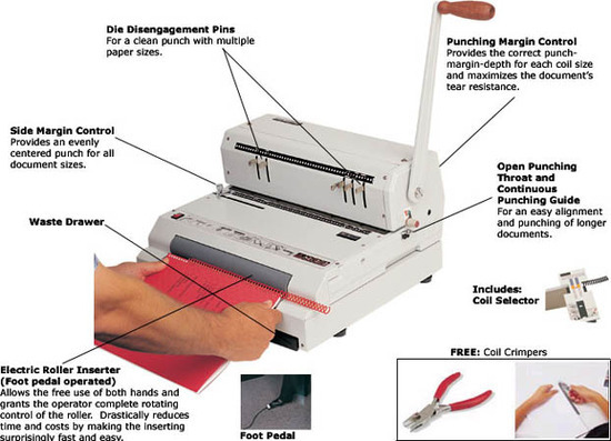 เป็นเครื่องเจาะกระดาษด้วยมือและเข้าเล่มด้วยไฟฟ้าแบบกึ่งอัตโนมัติ