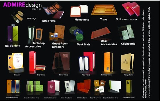หากคุณกำลังมองหาว่ารูปแบบของปกเมนู ปกเมนูร้านอาหาร เมนูไวน์ ปกใบประกาศนีย์บัตร โฟลเดอร์ใส่เอกสาร จะออกมาในรูปแบบใด คุณกำลังมองหามาถูกที่แล้ว Admire Design เราให้คุณมากกว่าคำว่า ปกเมนู เรายังให้ไอเดียเก๋ๆในการออกแบบวัสดุสามารถเลือกใช้ได้หลากหลาย อาทิเช่น หนังแท้ หนังเทียม ผ้าชนิดต่างๆ รูปแบบและขนาดของปก สามารถกำหนดได้ เลือกสกรีนโลโก้ ปั๊มจม ปั๊มนูน ปัก ได้ตามต้องการ รวมทั้งให้คำปรึกษาในการออกแบบจากผู้เชี่ยวชาญได้อย่างดีเยี่ยม เราสามารถทำให้ปกแฟ้มธรรมดา กลายเป็นของที่ช่วยให้ภาพลักษณ์ในการขายสินค้าดีขึ้น เป็นการออกแบบเฉพาะเพื่อคุณและไม่เหมือนใคร โดยไม่คิดค่าออกแบบ รับผลิต และ รูปแบบและขนาดของปก สามารถกำหนดได้ เลือกสกรีนโลโก้ ปั๊มจม ปั๊มนูน ปัก ได้ตามต้องการ