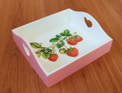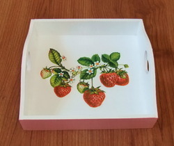 ถาดไม้ใส่ของเดคูพาจลายสตรอเบอร์รี่ หูจับฉลุรูปหัวใจ