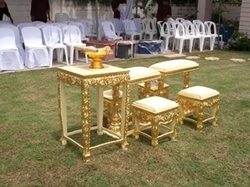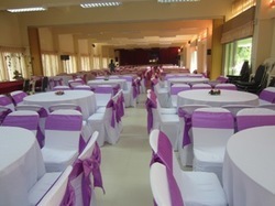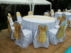 โต๊ะกลม+เก้าอี้พลาสติกคลุมผ้า+โบว์ทอง ชุดละ 480 บาท