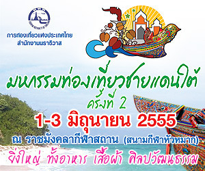 ททท.นราธิวาส ขอเชิญเที่ยวงานมหกรรมท่องเที่ยวชายแดนใต้ ครั้งที่ 2 ร่วมอุดหนุนสินค้าและผลิตภัณฑ์ของพี่น้องมุสลิมใน 3 จังหวัดชายแดนภาคใต้ และพบกับแพกเกจท่องเที่ยวภาคใต้ที่น่าสนใจ พร้อมทั้งชมการแสดงศิลปวัฒนธรรมและกีฬาพื้นเมืองของภาคใต้ อย่าพลาด 1-3 มิถุนายน 2555 นี้ ที่สนามราชมังคลากีฬาสถาน