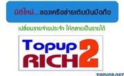 Toppup 2 Rich มิติใหม่ ของธุรกิจการเติมเงินมือถือ เติมเงินแค่เดือนละ 100 บาท รับรายได้เดือนละ 3 ล้านบาท สุดยอดแผนการตลาดที่ท่านจะต้องทึ่ง ไม่ดู ไม่รู้ ไม่ศึกษา น่าเสียดายนะค่ะ อย่ามัวเสียเวลาเดินทางอ้อมกับการเดินขายสินค้าอยู่เลยค่ะ เรามีทางตรงสู่ความเป็นมหาเศรษฐี มารวยด้วยการสร้างเครือข่ายของคนที่ใช้มือถือดีกว่า ไม่ว่าจะใช้เครือข่ายไหน โปรโมชั่นไหน เครื่องยี่ห้ออะไร สามารถนำมาใช้เป็นเครื่องมือสร้างธุรกิจได้หมดค่ะ
