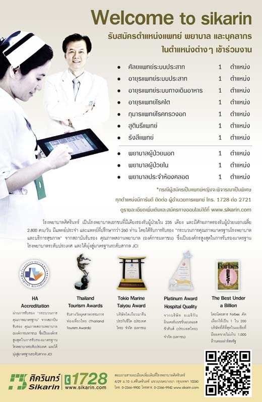 * กรณีผู้สมัครเป็นแพทย์หญิงจะพิจารณาเป็นพิเศษ ทุกตำแหน่งมีการันตี ติดต่อ ผู้อำนวยการแพทย์ โทร.1728 ต่อ 2721 ดูรายละเอียดเพิ่มเติมและสมัครทางออนไลน์ได้ที่ http://www.sikarin.com/job_main.php