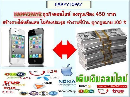สำหรับสมาชิกทุกคนที่สมัครและ Active ตัวเองเรียบร้อยแล้ว สามารถใช้บริการของ happy2pays ไม่ว่าจะเป็นการเติมเงินมือถือออนไลน์ เกมส์ออนไลน์ และการชำระค่าสาธารณูปโภคต่างๆ และอื่นๆ อีกมากมาย รวมไปถึงการสร้างเครือข่ายกับ happy2pays ซึ่งในปัจจุบันธุรกิจเกี่ยวกับโทรศัพท์มือถือนั้นจำเป็นกับชีวิตประจำวันของทุกคน แล้วคุณจะเสียเวลา และค่าธรรมเนียมต่างๆ ทำไม ในเมื่อ Happy2Pays ให้สิ่งเหล่านี้กับคุณได้ เพียงคุณมีระบบอินเตอร์เน็ตเท่านั้น