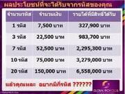 - มีสิทธิ์ได้รับรายได้ 3 แสนบาท ไม่จำกัดรอบ และรางวัลต่างๆมากมายตามโอกาส